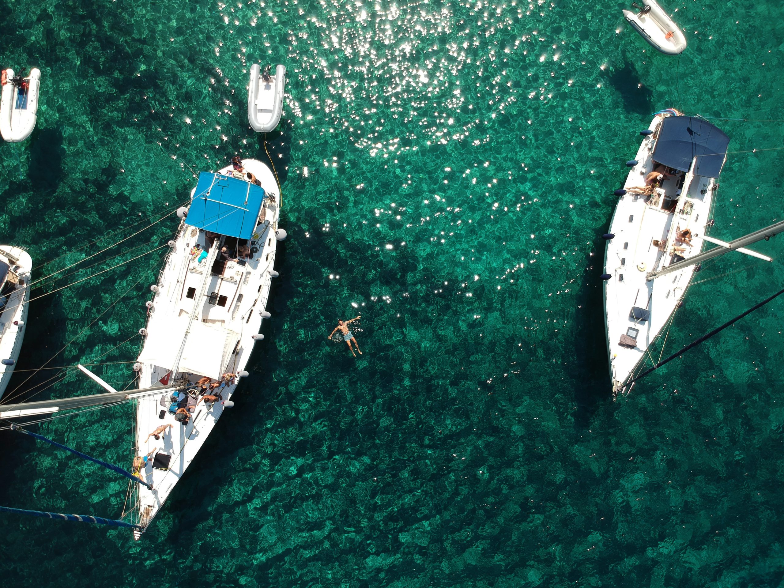 Para excursiones de un día, tiene capacidad para hasta 25 pasajeros (aunque limitamos el número a 20 para mayor comodidad), que pueden sentarse cómodamente en zonas sombreadas en la parte trasera, delantera y en el flybridge de este increíble catamarán. También hay muchos lugares para tomar el sol en la cubierta superior y en las dos redes elásticas situadas en la proa del yate. ¡Así que no se preocupe, hay espacio de sobra para todos!
