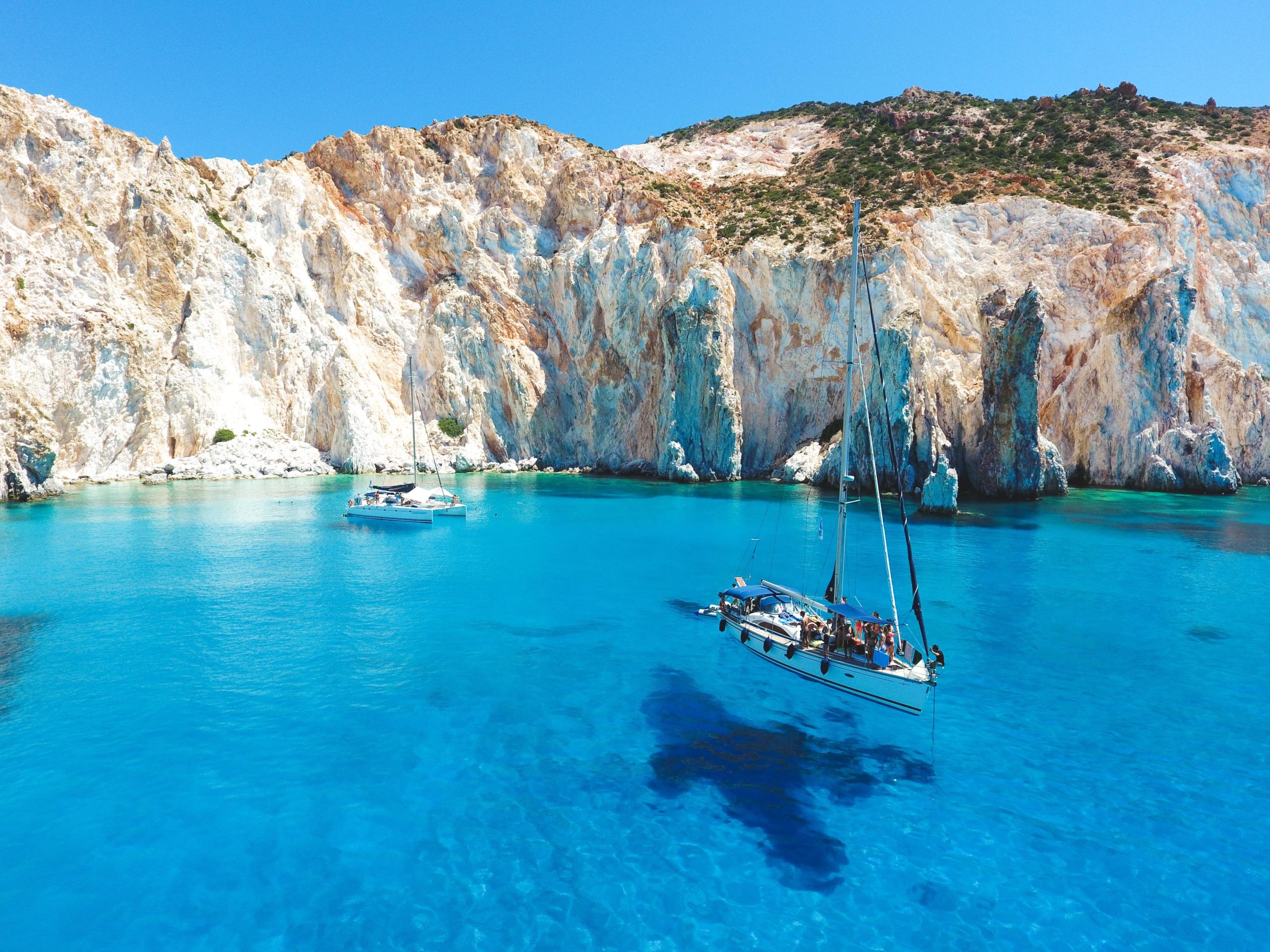 Las Cícladas disfrutan de un clima increíble. La lluvia rara vez es un problema. Para nosotros, el «mal» tiempo significa vientos muy fuertes. Pero incluso esos no afectarán nuestra excursión hasta el punto de tener que cancelar el viaje, excepto en casos muy raros. Sin embargo, podemos modificar el itinerario para navegar por el lado protegido de la isla y evitar navegar en mares agitados. Por ejemplo, durante los meses de verano, pueden soplar fuertes vientos del norte en todas las Cícladas (los llamamos meltemi). En este caso, preferimos navegar por el lado sur de Milos, que está protegido. No hay olas, no hay riesgo de mareos y hay muchos lugares hermosos para visitar, como Kleftiko y sus cuevas, que son magníficas incluso con los vientos del norte más fuertes. Además, el equipo de Polco está formado por regatistas de competición… nos gusta el viento y nos gusta desplegar las velas y ofrecer a nuestros huéspedes una auténtica experiencia de navegación. Así que no se preocupe, estará en buenas manos. Por último, siempre le informaremos de la ruta que seguiremos un par de días antes del viaje, después de tener en cuenta las condiciones meteorológicas.
