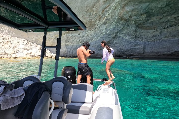 Notre bateau à moteur/Rib de 9,3 m est idéal pour explorer les plages inaccessibles de Milos même en une demi-journée sans manquer votre temps de baignade. De plus, vous le ferez avec style !